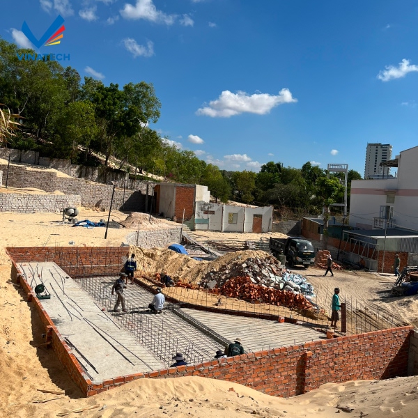 Bê tông tươi mác cao + phụ gia chống thấm: Sử dụng bê tông mác 250-300, trộn thêm phụ gia siêu hóa dẻo và chống thấm ngay từ đầu để tăng khả năng kháng nước 100%. Rung kỹ bằng đầm dùi điện, loại bỏ hoàn toàn bọt khí, đảm bảo lớp bê tông đặc chắc, không rỗng.